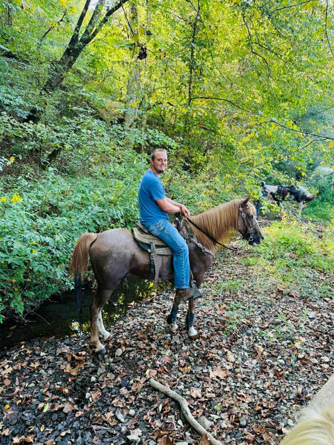 We have known Billy for the majority of his life and rode several miles along side him, as well as trail ridden him many times ourselves! Some friends of ours have had him for several years, this past year they added a child to their family and just simply decided to step back from the horse world during this era of their life. I was happy to acquire Billy this summer. We put him right back to work with no trouble, even after he had some time off. Billy has been and is loved.