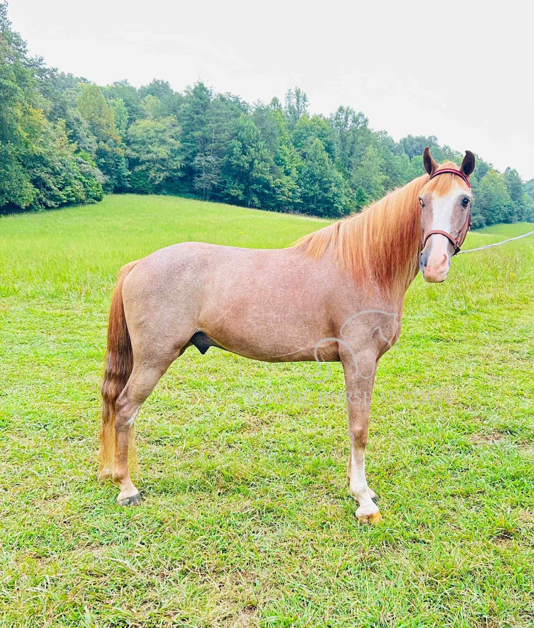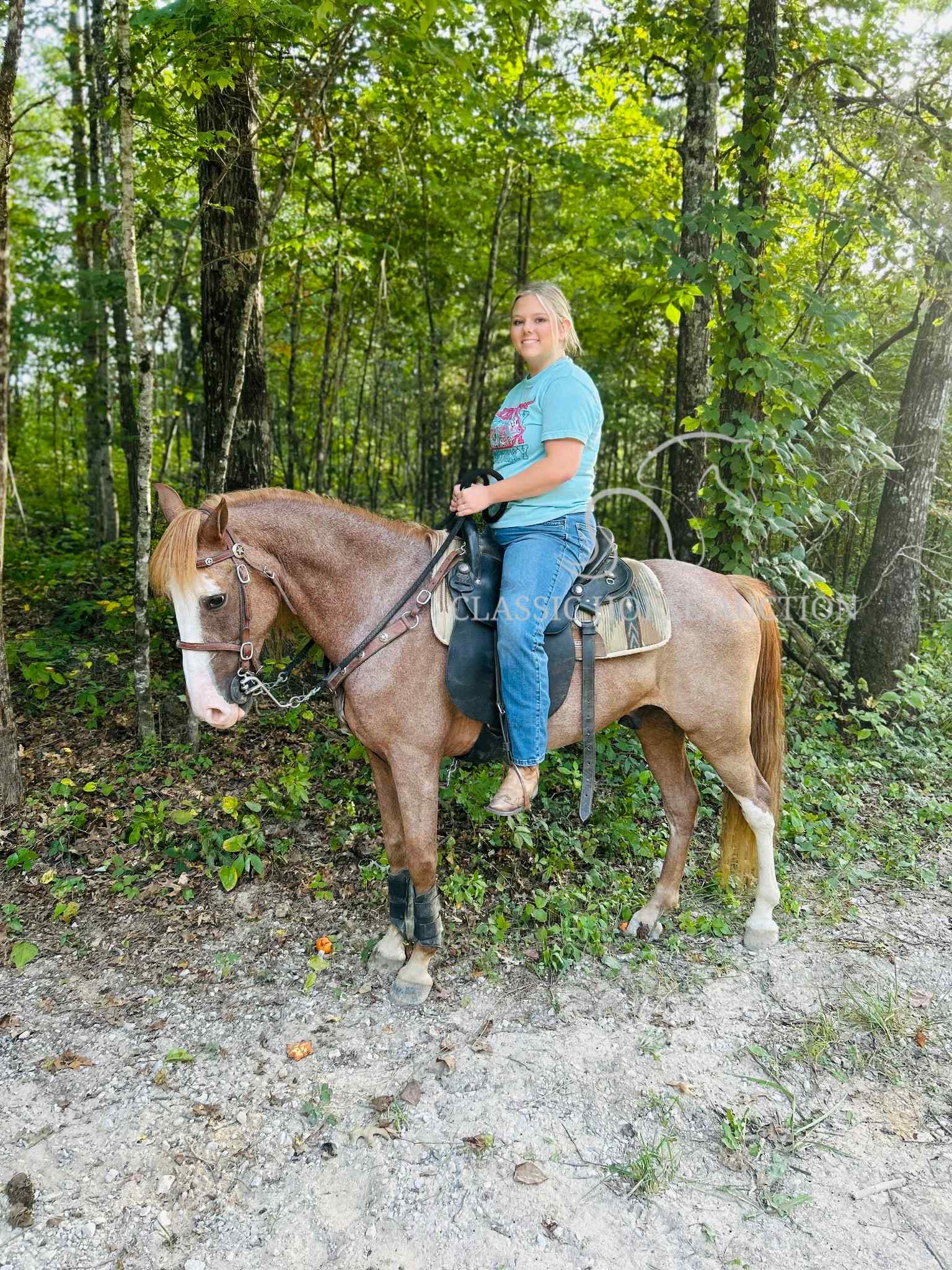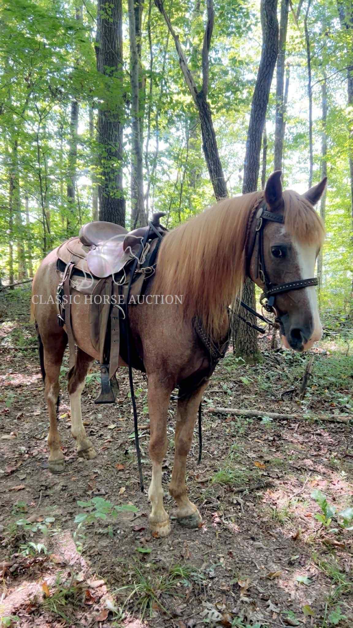 We proudly introduce to you, Billy, a 12 yr old grade TWH gelding. Billy is a beautiful sorrel sabino or as many old timers would say, a strawberry roan. He has an eye catching blaze, along with enough white markings to add some chrome. Billy also has a healthy, thick, blonde mane and tail! He isn’t just a pretty face though, Billy is an experienced trail mount! Billy has seen countless miles of trail riding, along with numerous camping trips. He has been both stalled and picket lined while camping. Billy easily loads and backs off the trailer with no fuss. He has encountered wildlife such as, deer, squirrels, rabbits, etc. while trail riding. He confidently crosses water, downed trees, and travels strategically through rocky and rugged terrain. He has spent many hours in the backwoods where the terrain requires skill.