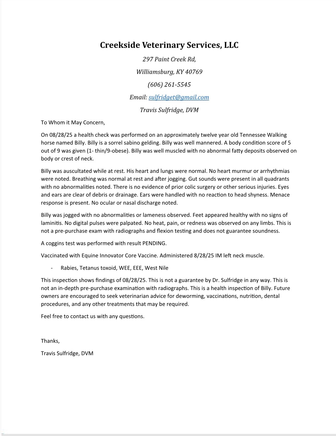 I encourage anyone interested to reach out via text message or call to further discuss Billy, or schedule a time to meet Billy in person before his auction ends. He is available for bidding or I will entertain Buy It Now offers over the phone or in person! Good luck and happy bidding! Courtney and Jordan Payne